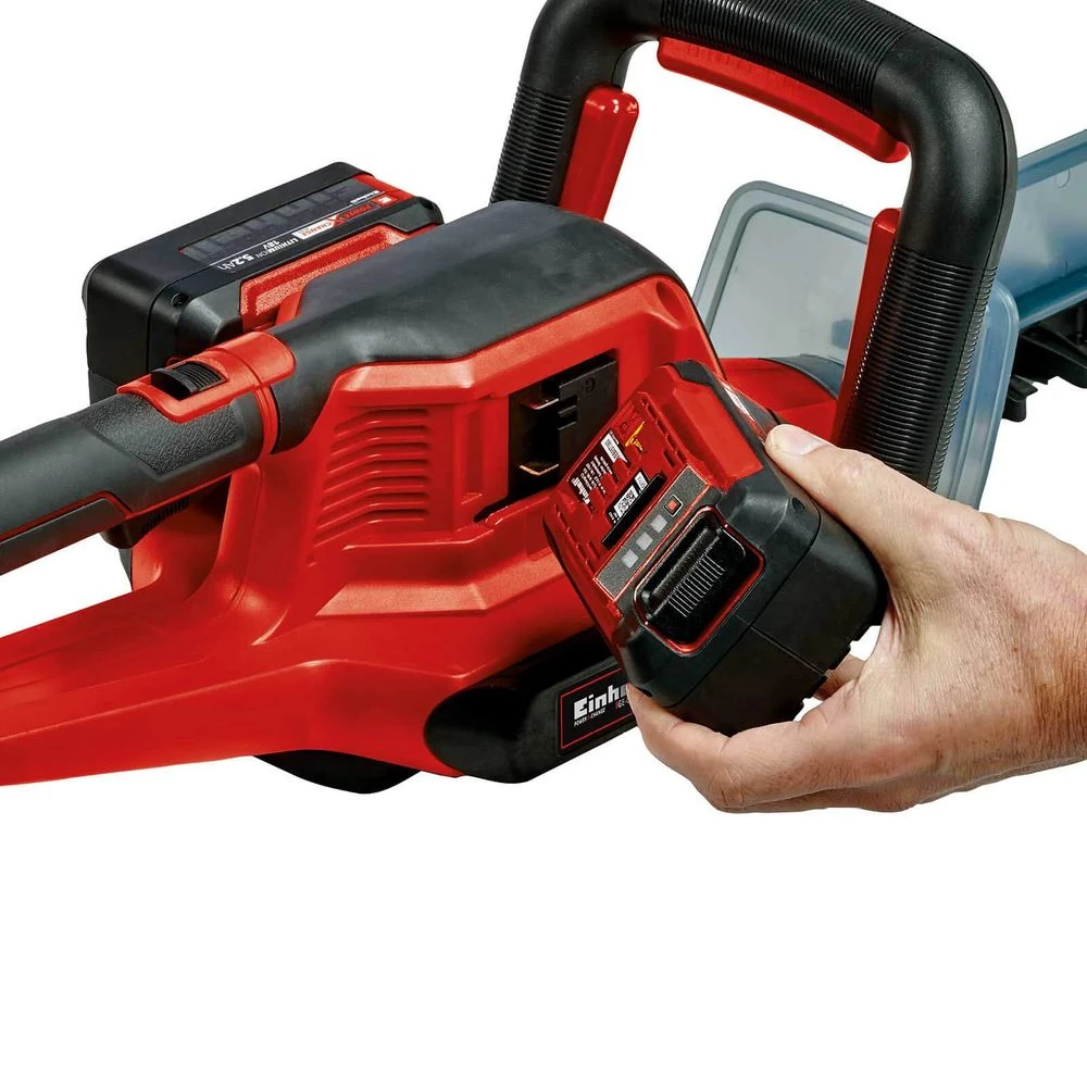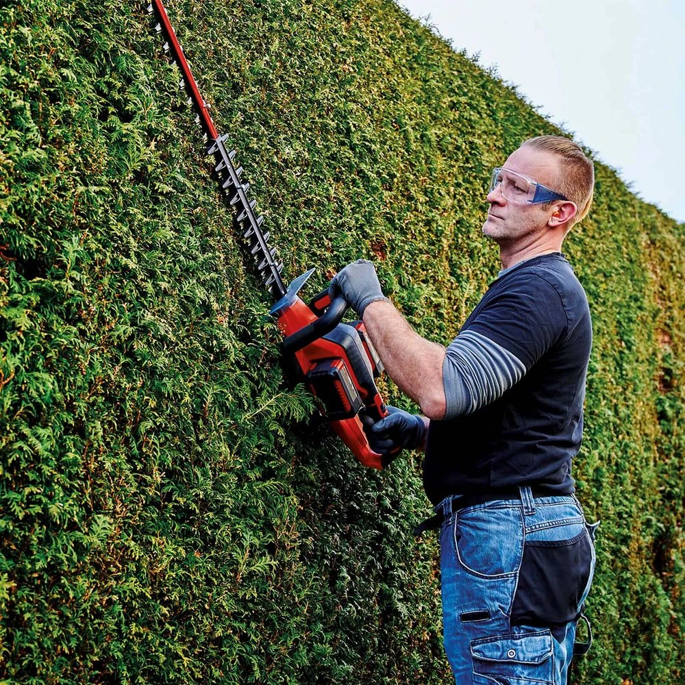 The Einhell GE-CH 36/65 Li-Solo cordless hedge trimmer is a powerful tool which operates without a cable thanks to Power X-Change. The hedge trimmer for cutting through hedges, shrubs and bushes is powered by two 18 V PXC rechargeable batteries. The cutters are made of laser-cut and diamond-ground steel and just like the metal gear unit, are designed for a long life. The rotating handle and ergonomic, slim line front handle with micro switch make it comfortable to work with.