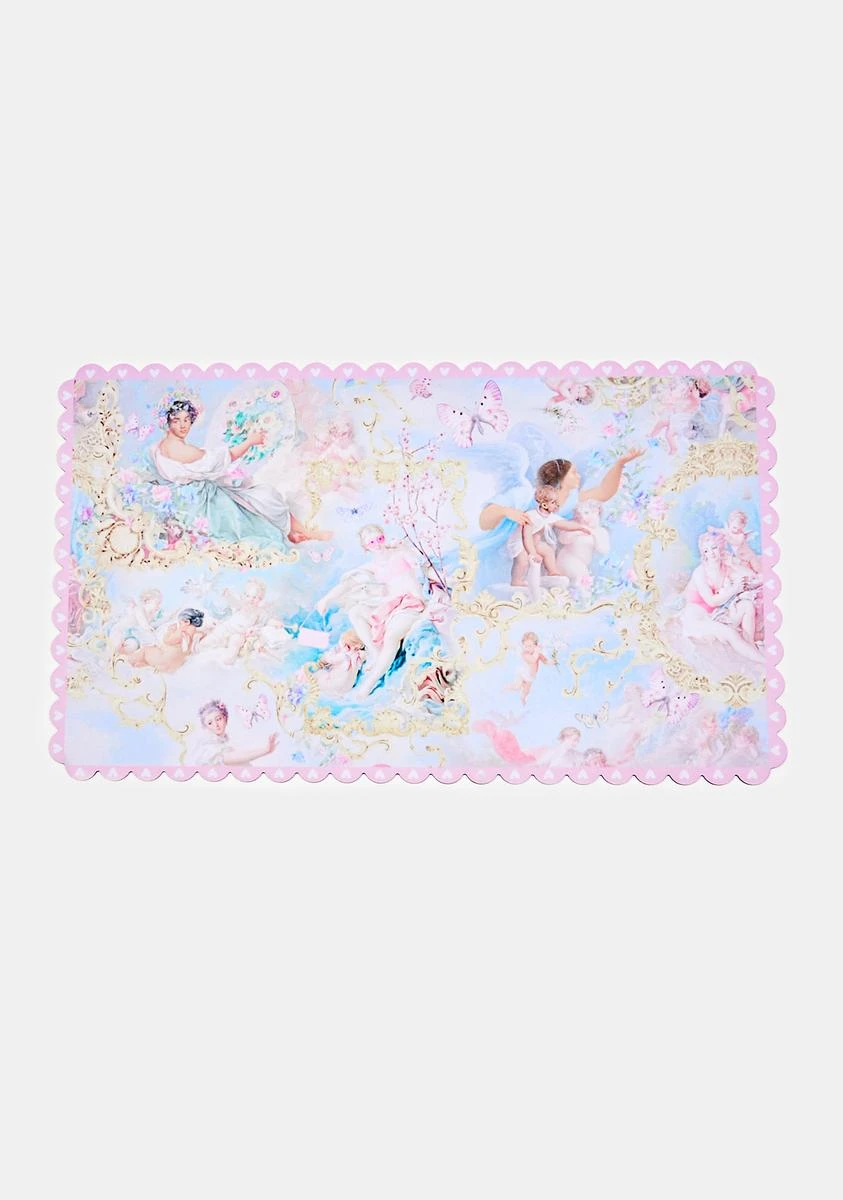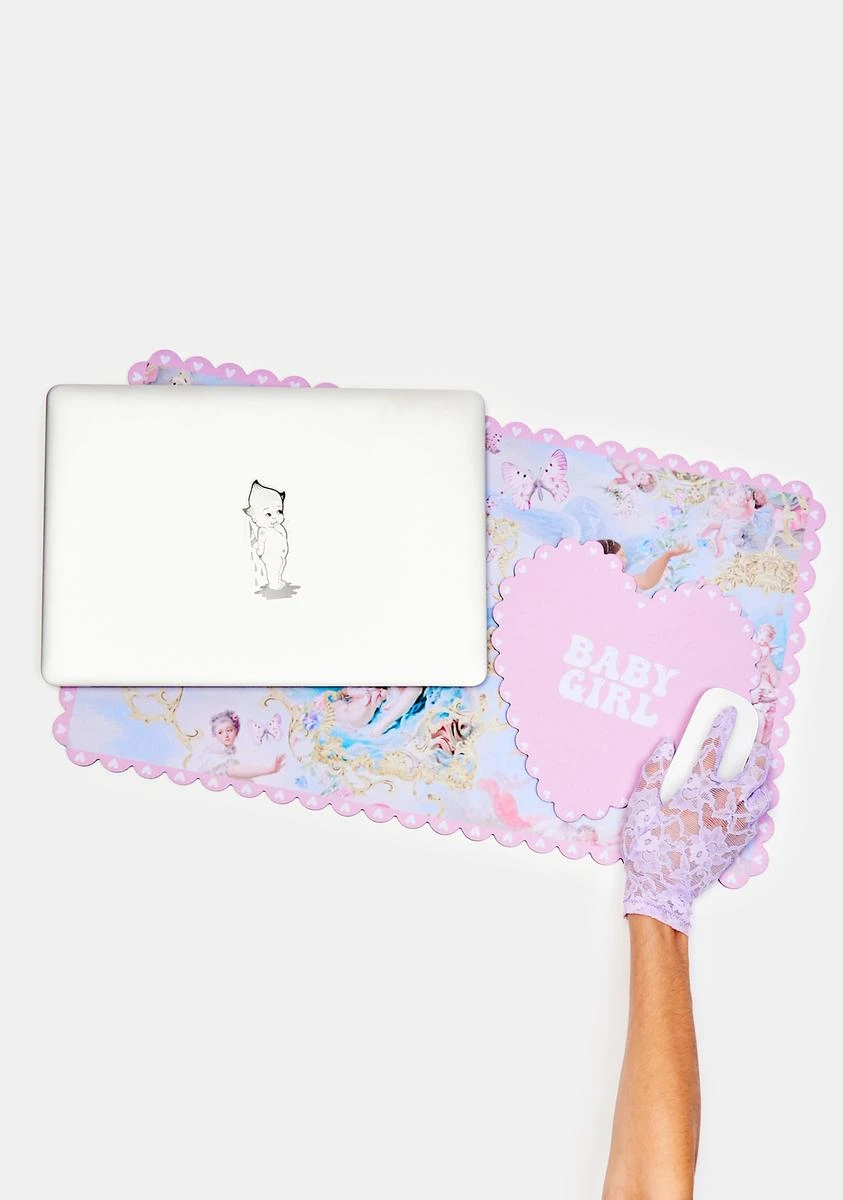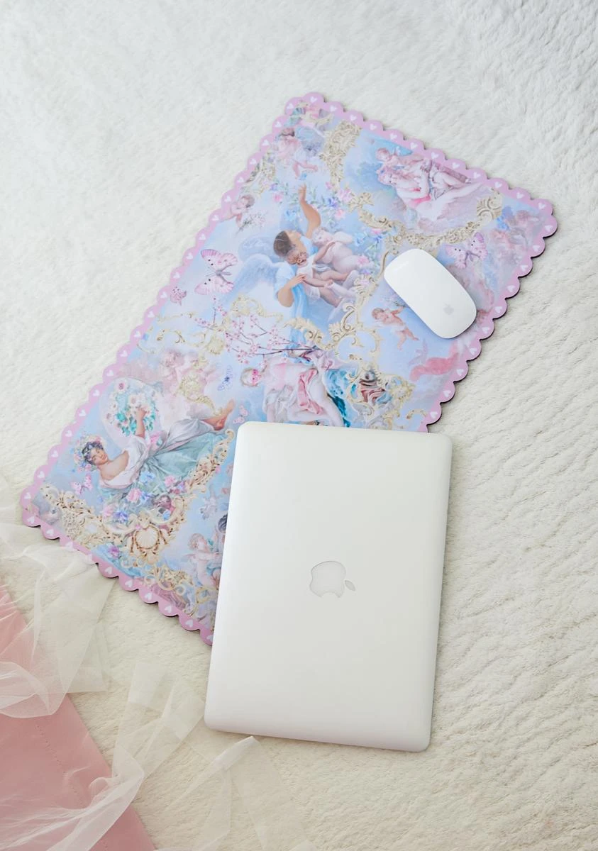 you’re sent from above. This large rectangle neoprene desk mat features a pastel cherubic print and scalloped trim.