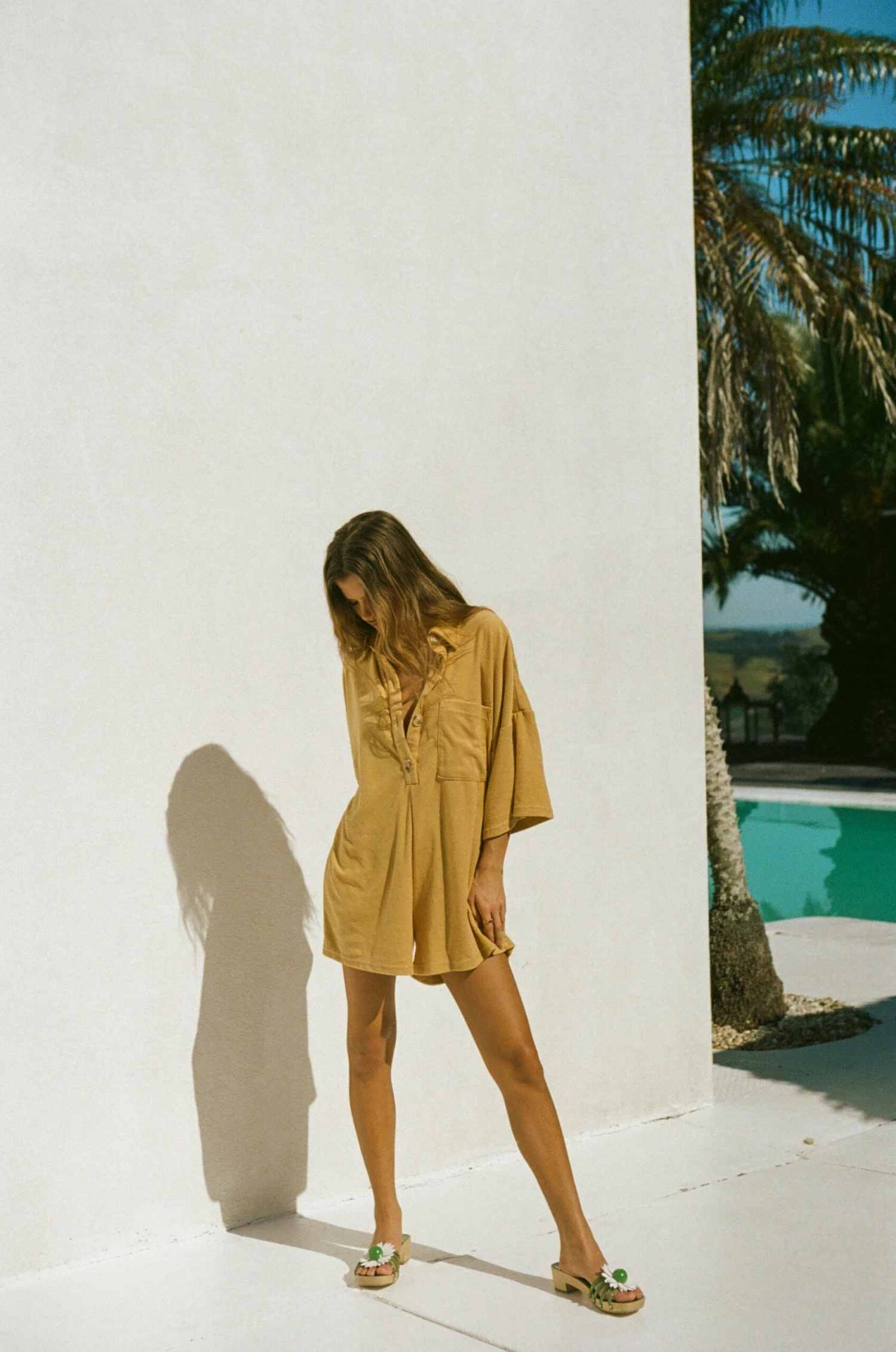 Casual comfy perfection to add to your day-to-day wardrobe rotation! The Milena Playsuit is made from a soft towelling fabric in a dusty orange hue. It is a relaxed style featuring drop shoulders, wide 3/4 length sleeves, collar, buttons down centre front and a breast pocket. Designed exclusively by Sabo.