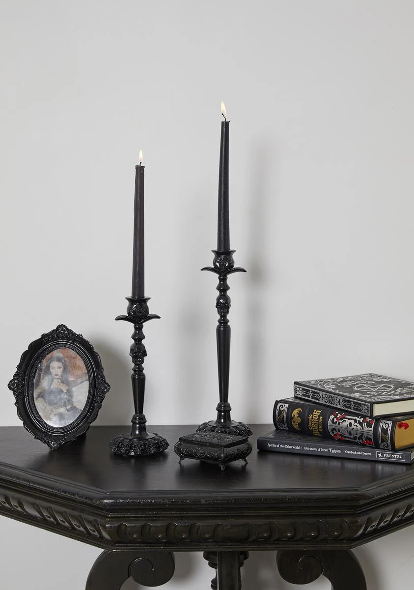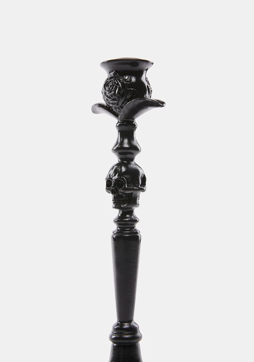 This candle holder comes with a skull detailed base, a stem with a skull detail, and a rose detailed holder.