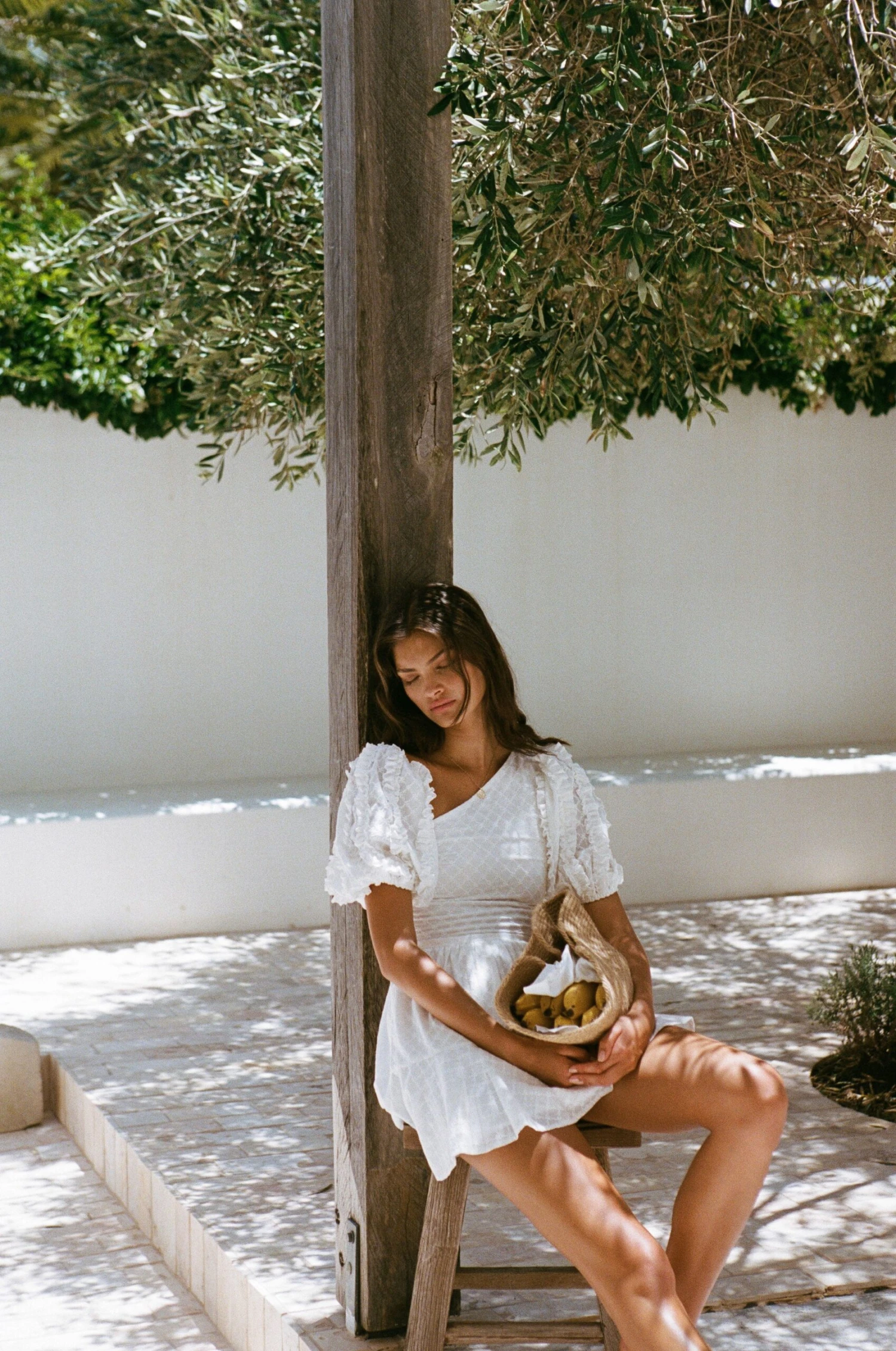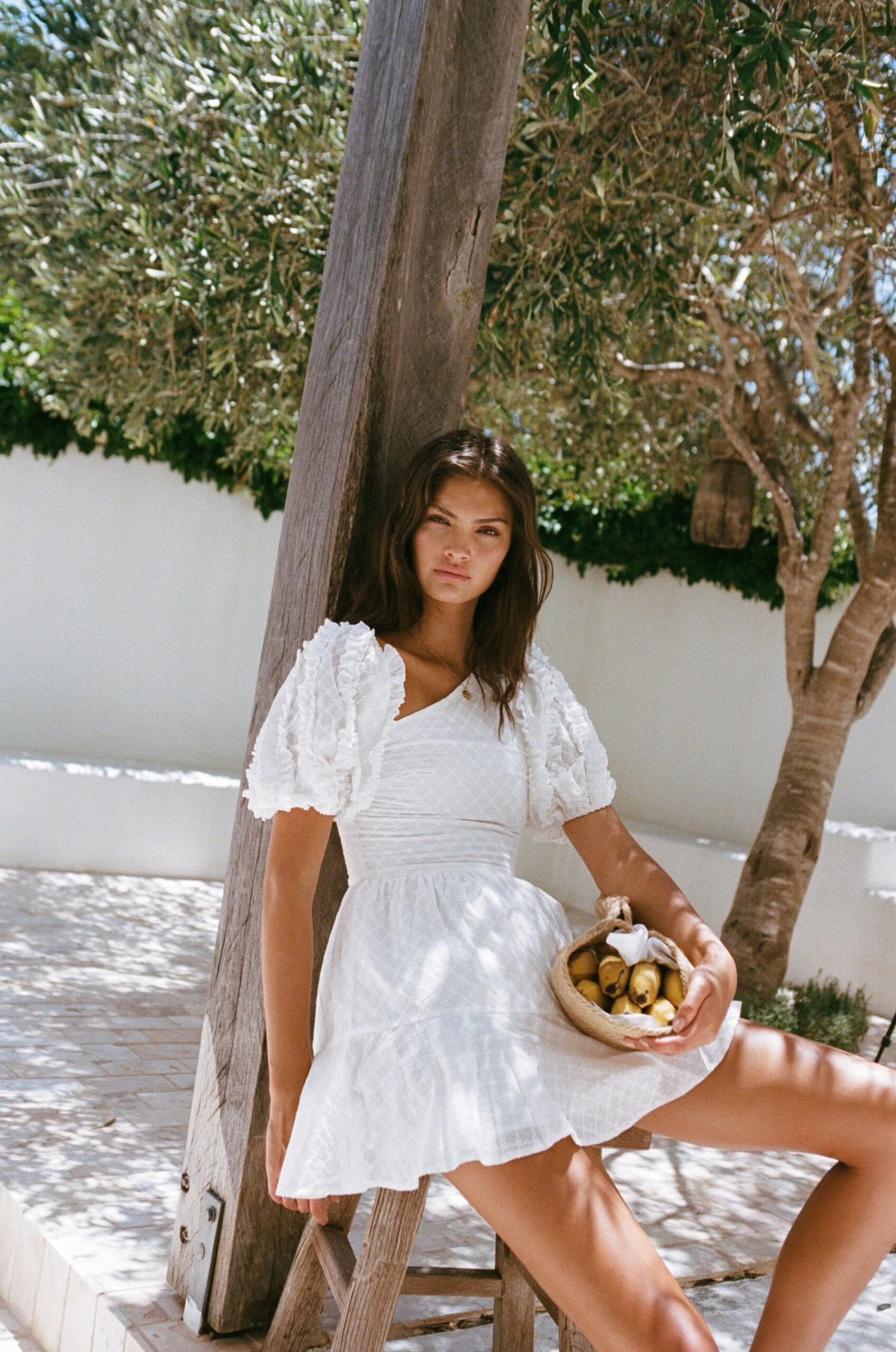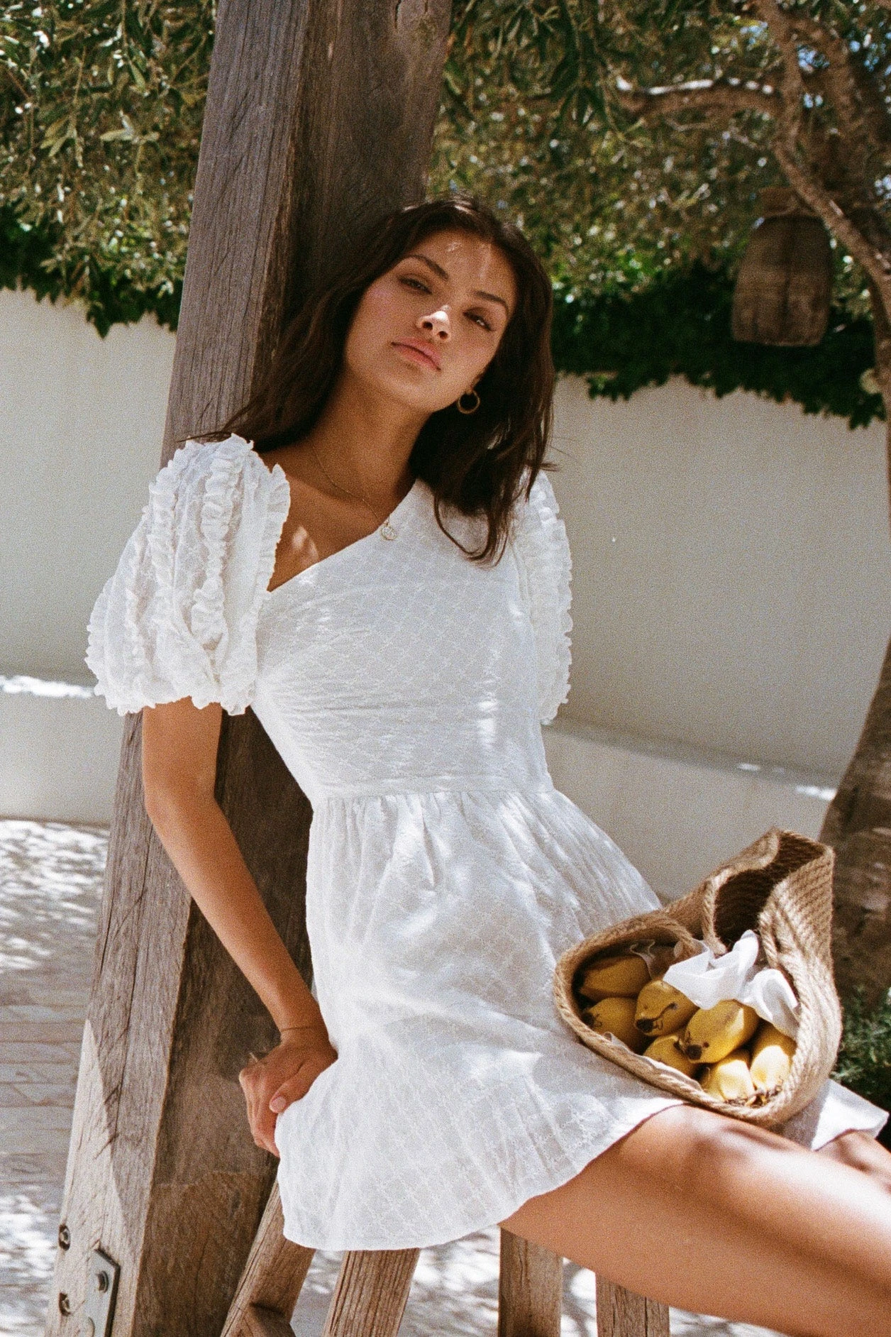 This SABO LUXE piece is perfect to wear to a bridal event or to dinner with the girls! The Yaz Frill Dress is made from a high quality natural cotton poppy broiderie in white. It features bold puff sleeves with frill details, asymmetric neckline and double tiered flouncy skirt. Style your look with the Strappy Rafaela Heels and Jamilla Bag! Designed exclusively by Sabo.